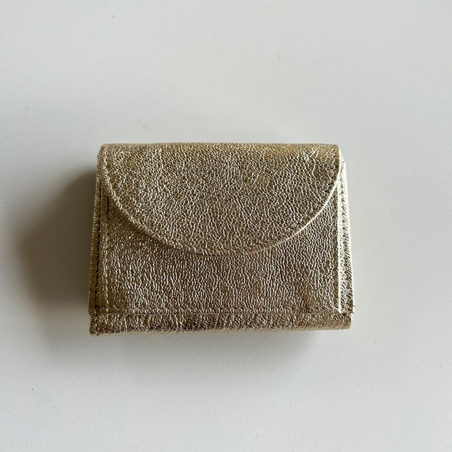 柔らかくしなやかなゴールド箔の山羊革を 贅沢に使用した三つ折りタイプのコンパクトなお財布。 3つのカード収納ポケットついており機能的。 日常づかいはもちろん、 ご旅行や、冠婚葬祭、小さめのバッグを持つ時などのセカンドウォレットとしても 1つあると便利です。 素材 山羊革 / レーヨン サイズ H / 9.5cm W/ 7.5cm D / 2cm